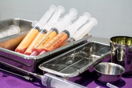 The fat that is harvested is cleaned and filtered and then transferred back into the breast to add volume to the breasts. The transfer process uses a small cannula (blunt needle), inserted through small needle pokes around the outside of the breast to inject the harvested fat into the breast.